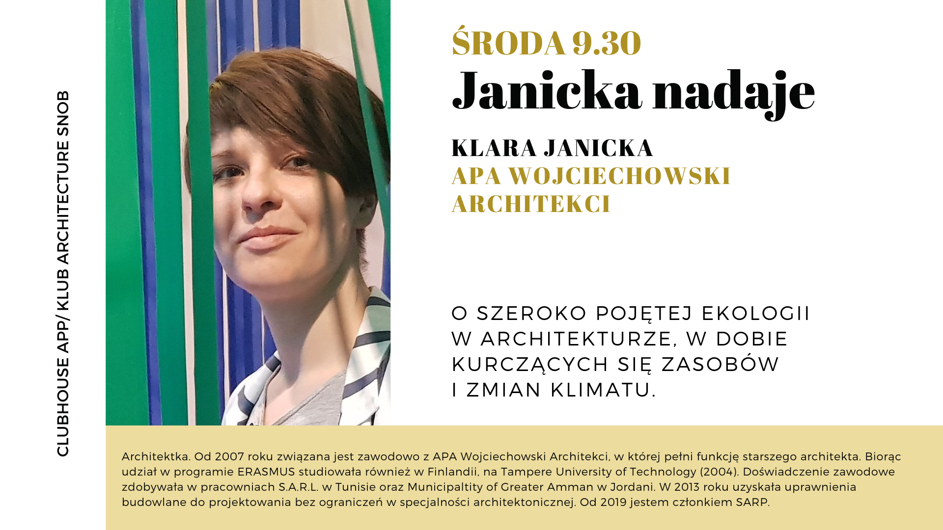 Klara Janicka – architektka. Od 2007 roku związana jest zawodowo z APA Wojciechowski Architekci, w której pełni funkcję starszego architekta. Biorąc udział w programie ERASMUS studiowała również w Finlandii, na Tampere University of Technology (2004). Doświadczenie zawodowe zdobywała w pracowniach S.A.R.L. w Tunisie oraz Municipaltity of Greater Amman w Jordani. W 2013 roku uzyskała uprawnienia budowlane do projektowania bez ograniczeń w specjalności architektonicznej. Od 2019 jestem członkiem SARP.