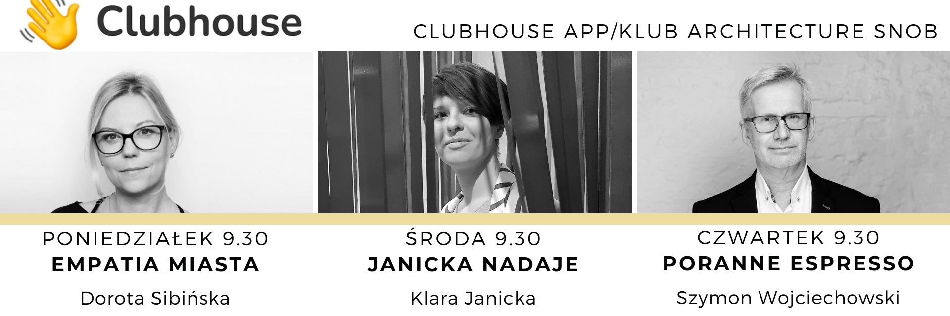 Klub Architecture Snob w aplikacji CLUBHOUSE debiutuje z cyklem rozmów o architekturze. CLUBHOUSE to sieć społecznościowa oparta o rozmowy na żywo. I przez „rozmowy” rozumiemy tu rozmowy głosowe – w Clubhouse nie ma niczego innego, żadnych tekstów, opisów czy obrazków. Użytkownicy aplikacji skupieni są wyłącznie na rozmowach „tu i teraz”. Redaktorzy magazynu Architecture Snob stworzyli własny klub, do którego zaprosili architektów, którzy poprowadzą autorskie rozmowy. Nasze zaproszenie przyjęli: Dorota Sibińska, architektka (XYStudio) oraz Klara Janicka i Szymon Wojciechowski, architekci (APA Wojciechowski Architekci).
