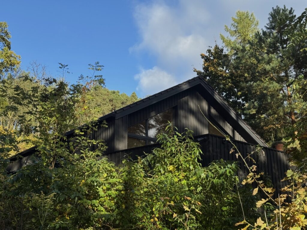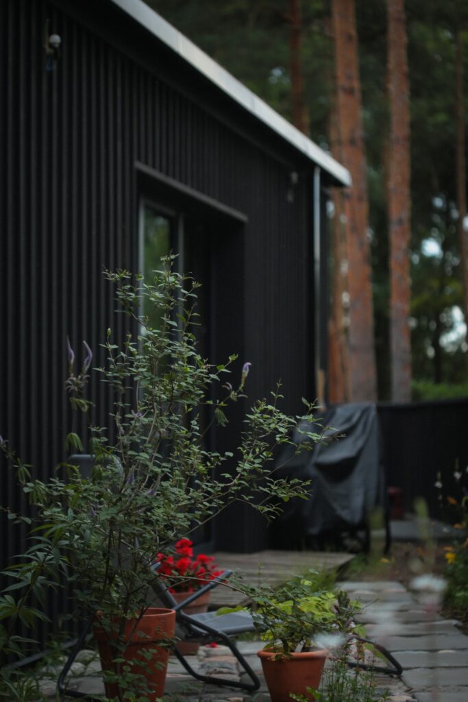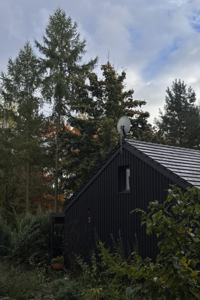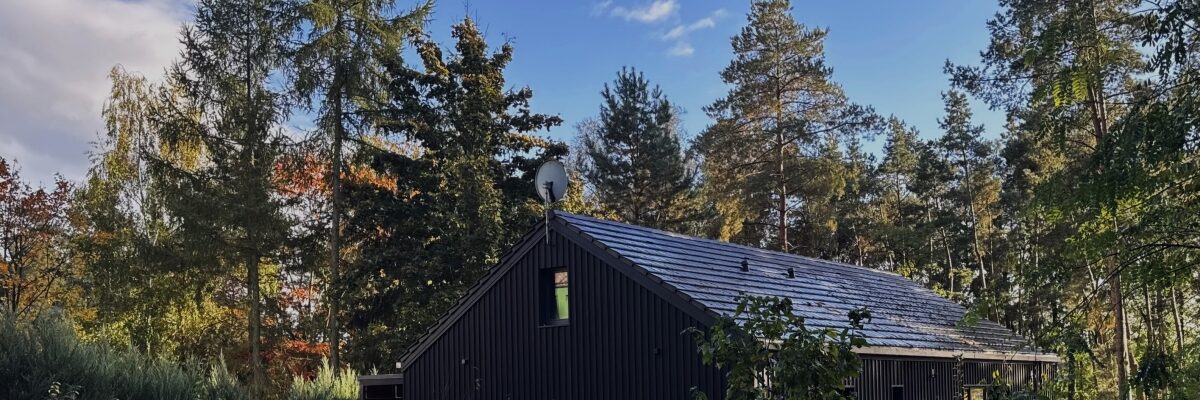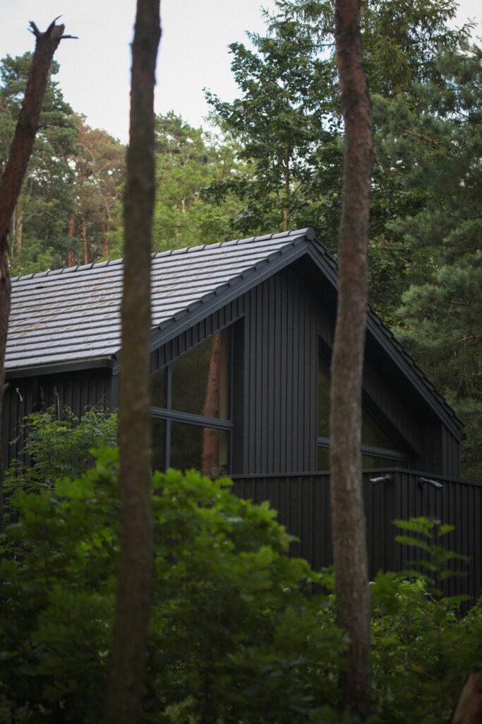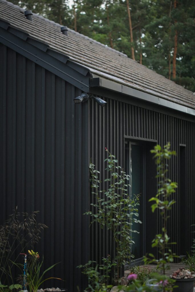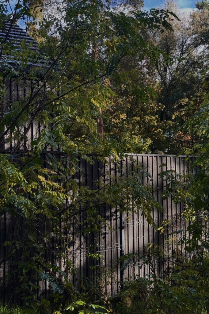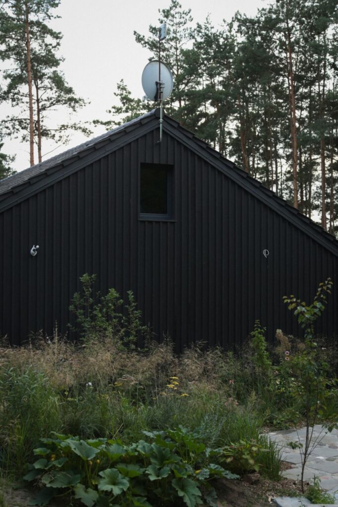 Bryła domu wpisuje się w teren bez ambicji dominacji. Częściowe wtopienie w skarpę i ciemna tonacja drewna sprawiają, że budynek stapia się z lasem. Taras nad wiatą samochodową naturalnie przedłuża przestrzeń dzienną, otwierając ją na ogród zaprojektowany w duchu permakultury – z rodzimymi gatunkami drzew, ziół i traw. Obecność zwierząt – łosi, dzików, wiewiórek – staje się tu elementem codzienności, nie egzotycznym zjawiskiem.