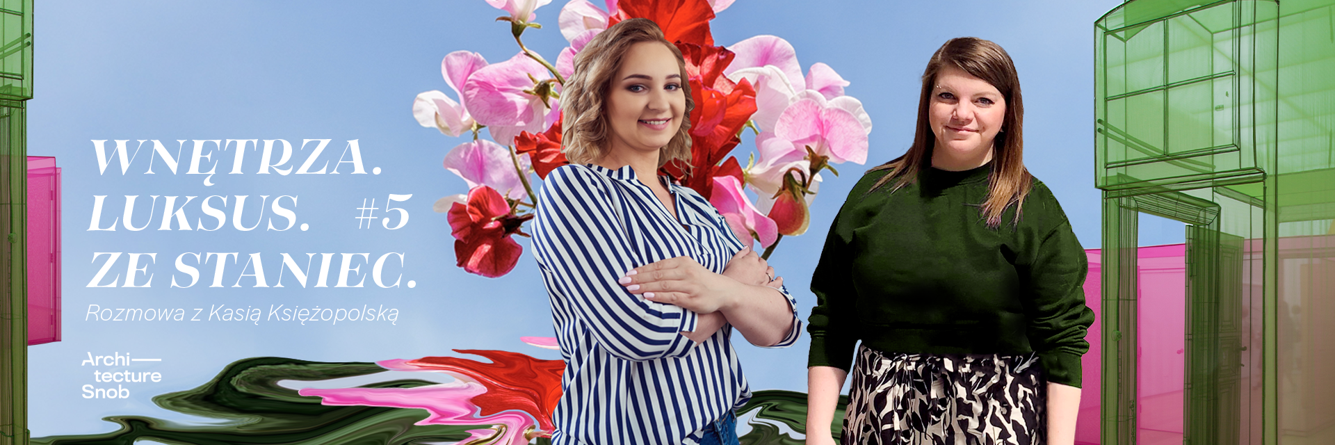 Piąta odsłona podcastu idzie równolegle z piątym projektem okładki. Praca nad kolażem wykonywanym przez Ewę Ziembicką tak została opisana przez samą autorkę: „Szukając materiałów do kolażu z Kasią Księżopolską zależało mi na wyborze współczesnych obiektów, które będą miały wyraźny charakter. Miały nawiązywać również do młodej sceny wzornictwa, którą swoją działalnością promuje Księżopolska. Z kompozycji wyraźnie czuć świeżość i kreatywność. Mocne i energiczne kolory podkreślają silne charaktery i dynamiczny styl pracy obu bohaterek kolażu. Dominującym kolorem jest róż, symbol kobiecej energii, który w zestawieniu z delikatnym błękitem nieba, nawiązuje do natury, która jest również moją największą inspiracją.”