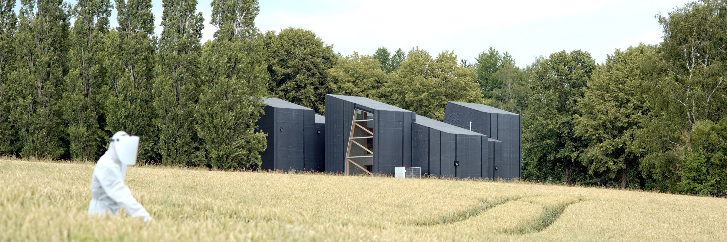 The walls and roofs are made of prefabricated wooden coffers attached to a reinforced concrete slab and covered with a black, waterproof, rubber membrane. It creates the illusion of the building being in the shade and allows it to remain almost invisible from the outside. Its purpose is not to be seen but used. Its structure has been reduced to the basic elements necessary to the artistic practices that are performed in it.
