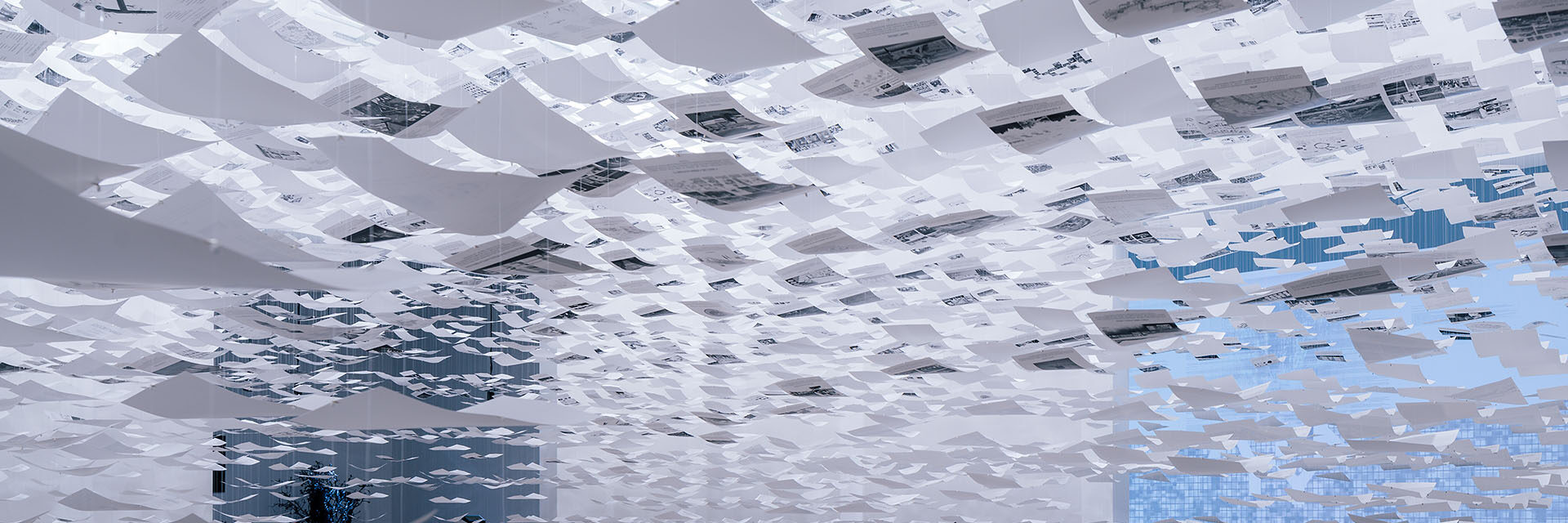 The Venice Biennale gathers the projects of various types, sizes and budgets. It’s a place where it is difficult to rivet the viewer’s attention, and thus, you have to present your ideas in an expressive manner. Our pavilion has a very clear spatial layout composed of two zones: the central zone, which we call the “Cloud of Uncertainty”, and the exhibition space surrounding it, in which all the designs are being presented. The “Cloud” has 7,000 cards hanging in the air with all the portfolios received in the open call. Metaphorically, it is intended to represent our atomised society in which, as we are being convinced, we are all mavericks and have no common strategies or goals. However, the surrounding space proves that this vision doesn’t correspond to reality and that we are actually connected in many ways. This seemingly static and dispersed “Cloud” is rather a dynamic and complex network with micro-connections that can change the entire ecosystem. To illustrate these interdependencies between projects, we invented a “Draw” mechanism. The use of the play of lights and short videos allows to combine projects depending on the conceptual framework they are challenging. Thus, the exhibition seems different during each visit, reflects the constant changeability of our reality and does not offer ready-made solutions. Each visitor sees something different, and can interpret what they see in their own way.